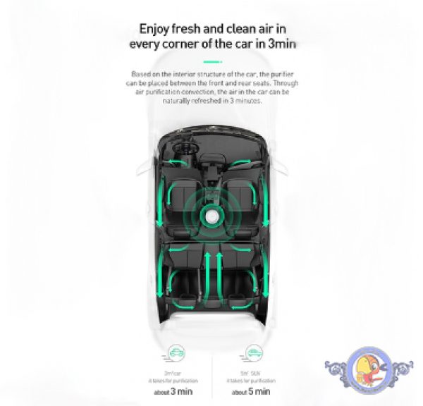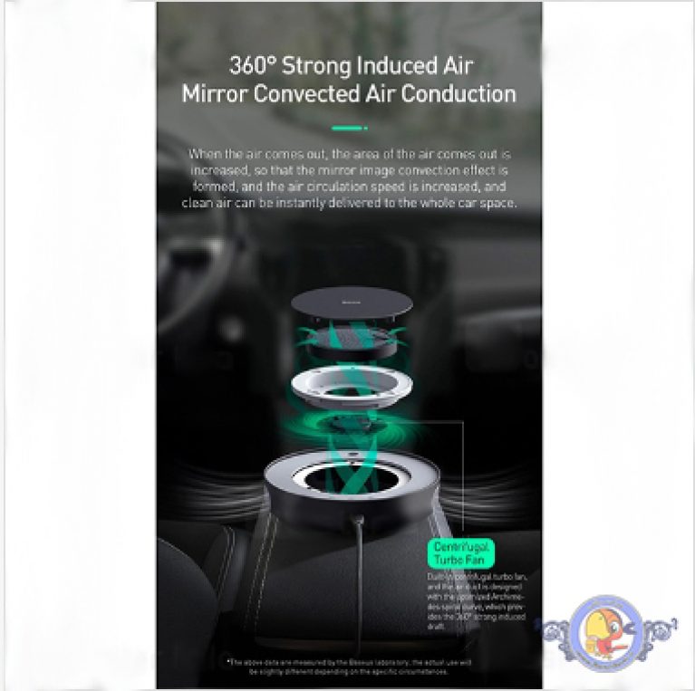 دستگاه تصفیه هوای بیسوس می تواند هوا را بصورت 360 وارد و پس از تصفیه با دو قدرت متفاوت آن را به بیرون هدایت کند تا هوای خودرو یا اتاق شما کاملا پاکیزه شود. این دستگاه هوای ماشین های سدان را تا 3 دقیقه و خودروهای SUV (شاسی بلند) را پس از 5 دقیقه بصورت کامل تصفیه می کند. صدای چرخش فن این محصول نیز بسیار کم بوده و تنها 30 دسی بل می باشد. برای درک بهتر کم بودن صدای این دستگاه می توانیم اشاره کنیم که صدای محیط کتابخانه در حالت عادی 45 دسیبل می باشد.