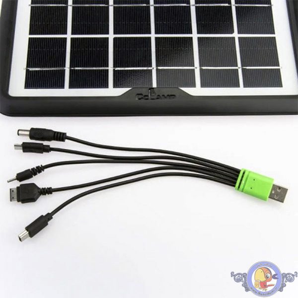 این پنل خورشیدی با تولید ۳٫۸ وات توان از طریق انرژی خورشید و شارژ دستگاه مقابل با شدت جریان خروجی 0.63 آمپر و ولتاژ 6 ولت انرژی مورد نیاز برای شارژ گوشی، تبلت، اسپیکر و … را برای شما فراهم میکند. توجه کنید که این محصول هیچ باطری داخلی ندارد. حتی اگر هیچ کدام از سوکت های شارژر به دستگاه شما نمیخورد میتوانید به راحتی سیم ۵ سر را جدا کنید و از کابل مخصوص به خود استفاده نمایید. سوکت خروجی این شارژر خورشیدی یک درگاه استاندارد usb است .