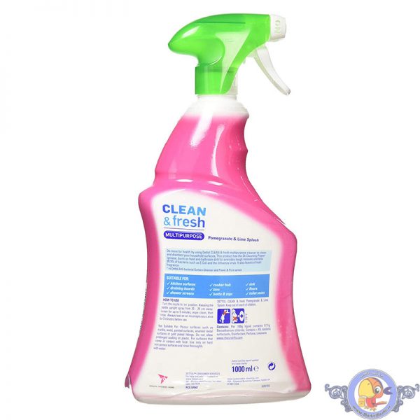 پاک کننده چندمنظوره دتول Dettol مدل Clean & Fresh انار ۱ لیتر ، آنتی باکتریال و دارای پاک کنندگی 3 برابر، مناسب برای سطوح آشپرخانه،حمام و سرویس بهداشتی میباشد و 99.9% باکتری ها را از بین میبرد.این محصول یک تمیز کننده قدرتمند است که با استفاده از آن لکه های سخت از بین میبرد.پاک کننده چند منظوره دتول با رایحه انار، عطر و بوی دلپذیر و ماندگار انار تازه را به محیط میبخشد. کمپانی دتول با استقبال بسیار زیادی که از طرف خریداران شد ،این بار این اسپری را در حجم ۱ لیتر و با قیمت اقتصادی تر به بازار عرضه کرده.این اسپری آنتی باکتریال یکی از محصولات Dettol میباشد که شما میتوانید با استفاده از این محصول تمام میکروب ها و باکتری های موجود در سطح حمام و دستشویی و … خود را از بین ببرید. این اسپری دتول تمام چربی ها و رسوبات موجود روی سطح را از بین میبرد.