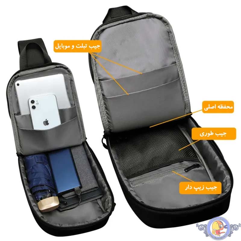 زیپ های کیف نیز بسیار باکیفیت هستند و طراحی ضد آب دارند که هیچ گونه آبی در اثر بارندگی به داخل آنها نفوذ نمیکند و بسیار روان و دارای طول عمر بالایی هستند. بند دوشی کیف نیر دارای لایه پد عرق گیر برای تنفس و جلوگیری از عرق کردن بدن شما میباشد. داخل بند نیر از فوم برای راحتی هر چه بیشتر در زمان حمل استفاده شده. داخل کیف که به دو بخش تقسیم میشود ، یک بخش برای دسترسی فوری در بغل کیف است. بخش داخلی آن که شامل فضای تبلت با فوم های ظربه گیر و تقسیم بندی های مختلف برای قرار دادن کارت های بانکی، پاوربانک، گوشی ، دفتر و خودکار است که در عکسها مشخص میباشد. کیف دارای یک دسته باکیفیت جهت حمل دستی نیز میباشد.