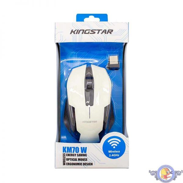 ماوس کینگ استار مدل KM70W محصولی دوست داشتنی از شرکت کینگ استار است که از طریق دانگل USB به رایانه شما متصل میشود. به یاری پشتیبانی از فرکانس 2.4 گیگاهرتزی، این ماوس میتواند از فاصله 10 متری از رایانه شما به کنترل اشارهگر رایانه بپردازید. حسگر ماوس کینگ استار مدل km70w از نوع اپتیکال بوده و به یاری آن میتوان روی انواع سطوح از این ماوس استفاده کنید. این ماوس از سه کلید برای اجرای درخواستهای کاربر استفاده میکند.به یاری وجود سنسور اپتیکال ارایه شده روی km70w از این ماوس میتوان روی سطوح مختلف به راحتی استفاده کرد.