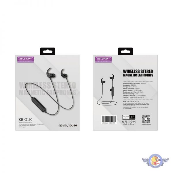 هدفون بی سیم کلومن مدل KB-G190 از سری هدفونهای بیسیم باریک و سبک است که میتوانید تمام روز از آن استفاده کنید و لذت ببرید. KB-G190 طوری طراحی شده است که سیم این هدفون دور گردن شما قرار میگیرد و احتمال افتادن آن در هنگام ورزش و فعالیت بسیار کم است. پاسخ به تماسهای تلفنی و پخش آهنگ فقط با فشردن یک دکمه برای شما امکانپذیر است.